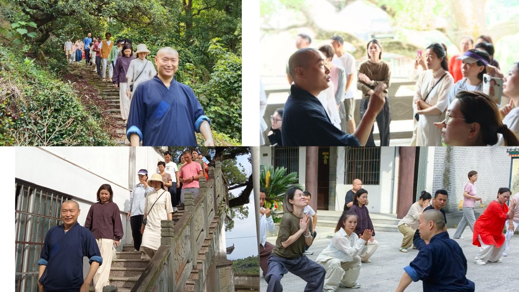 6月21日清晨 ,法师带领学员沿大罗山径徒步,并习练传统养生功法“易筋经”,将身体调适与心灵净化结合,体现“禅修与生活融合”的理念。