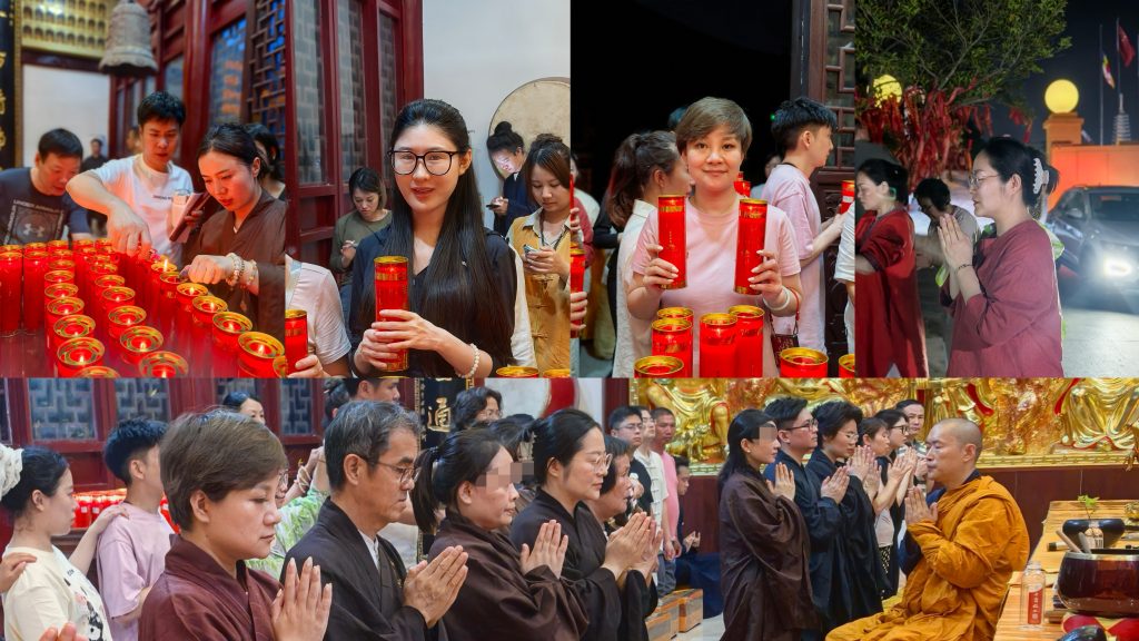 晚间互动答疑环节 ,学员就“分别心如何化解”“情绪与禅定关系”等问题与法师交流,现场氛围恳切热烈。最终,学员们以部分学员皈依、许愿、供灯仪式结束一日修行,灯火点点中寄托对生命觉醒的祈愿。